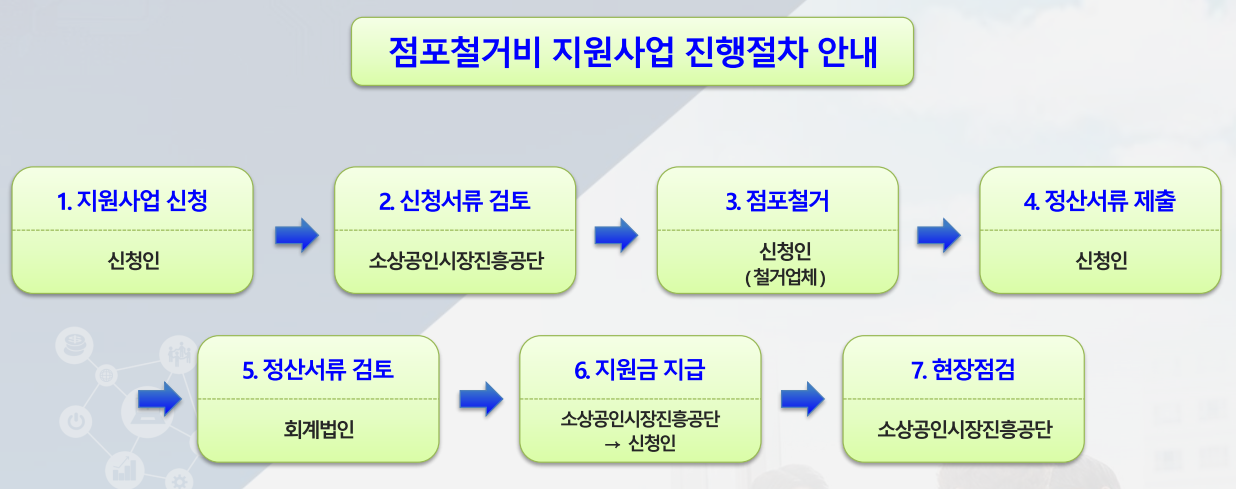 - 점포철거 지원: 전용면적당 13만원 이내에서 지원, 최대 250만원까지 점포철거 및 원상복구 비용 지원.
